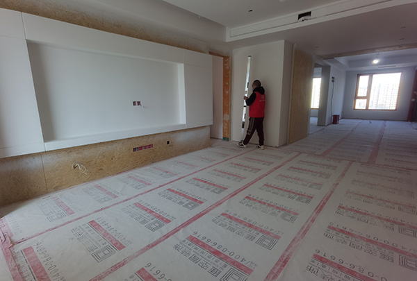 第二、燈光打磨:工人在做乳膠漆、墻紙、硅藻泥等基層的時(shí)候,全部帶燈光進(jìn)行打磨,保證墻面,頂面基層的平整度和飽滿度。