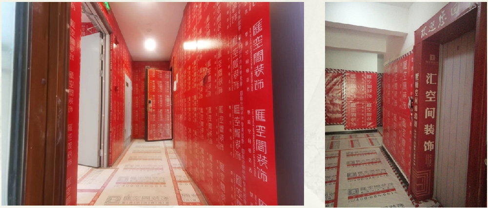 電梯口、入戶門保護:電梯門口及入戶門用公司專用的保護膜進行保護,要求保護膜裁剪平直,字體朝外,用膠帶粘接平直牢固。 門把手用專用把手套進行保護,其中“匯空間在此施工,”如有不便,敬請諒解,的小標識用透明膠帶粘貼于入戶門保護膜上.