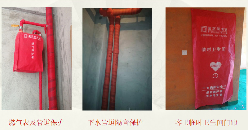 開工前對燃氣表及管道、下水管道保溫隔音降低樓上下水產(chǎn)生的噪聲、客衛(wèi)臨時衛(wèi)生間門簾保障文明施工