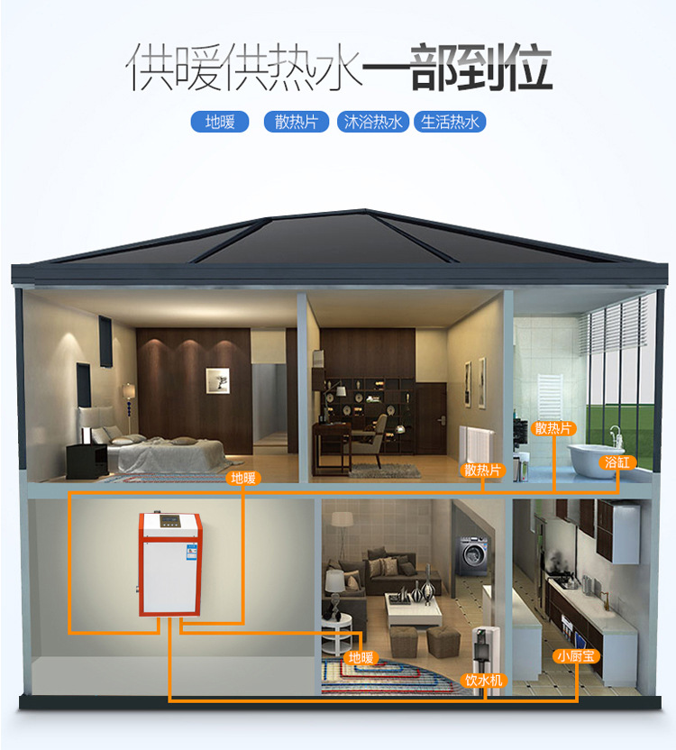 壁掛式電鍋爐可以直接與傳統散熱器或低溫地板采暖系統連接,也可與中央空調組合供暖。